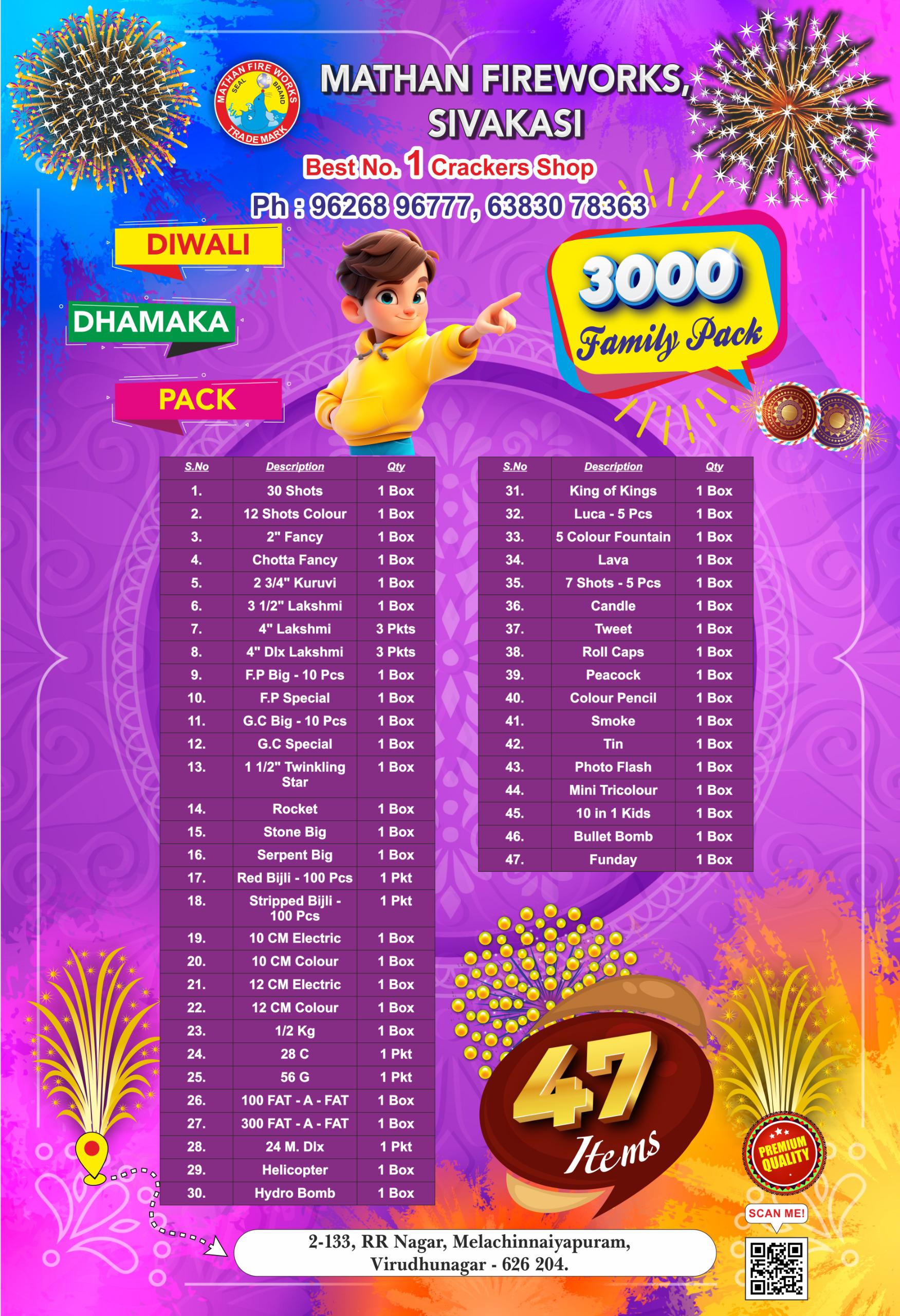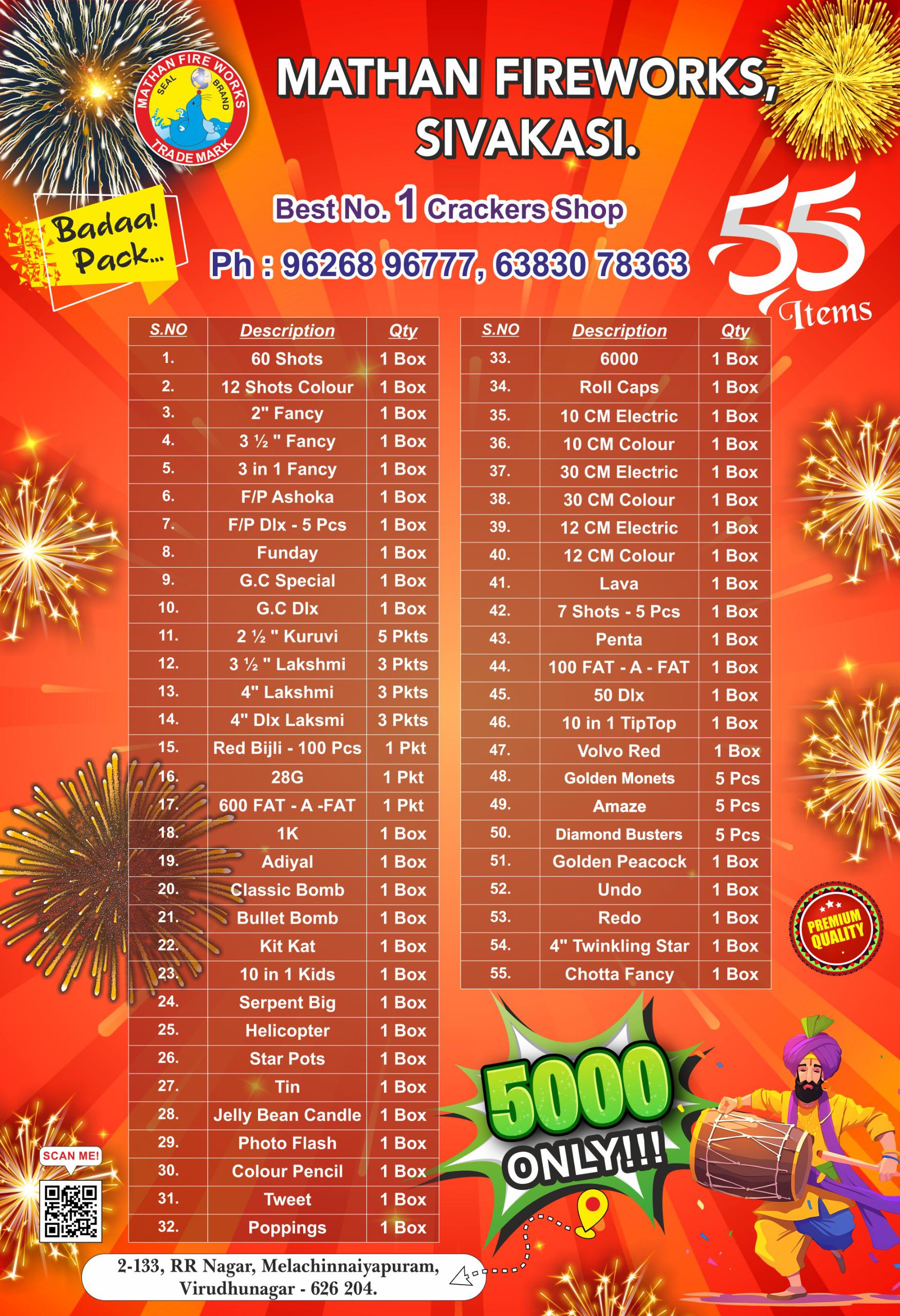 உங்கள் வீட்டு விஷேசங்கள், கோவில் திருவிழாக்கள் மற்றும் தீபாவளிக்கு தேவையான அனைத்து விதமான பட்டாசுகள், வானவேடிக்கைகளை மொத்த விலைக்கே தமிழ்நாடு முழுவதும் பாதுகாப்பாக அனுப்புகிறோம்.