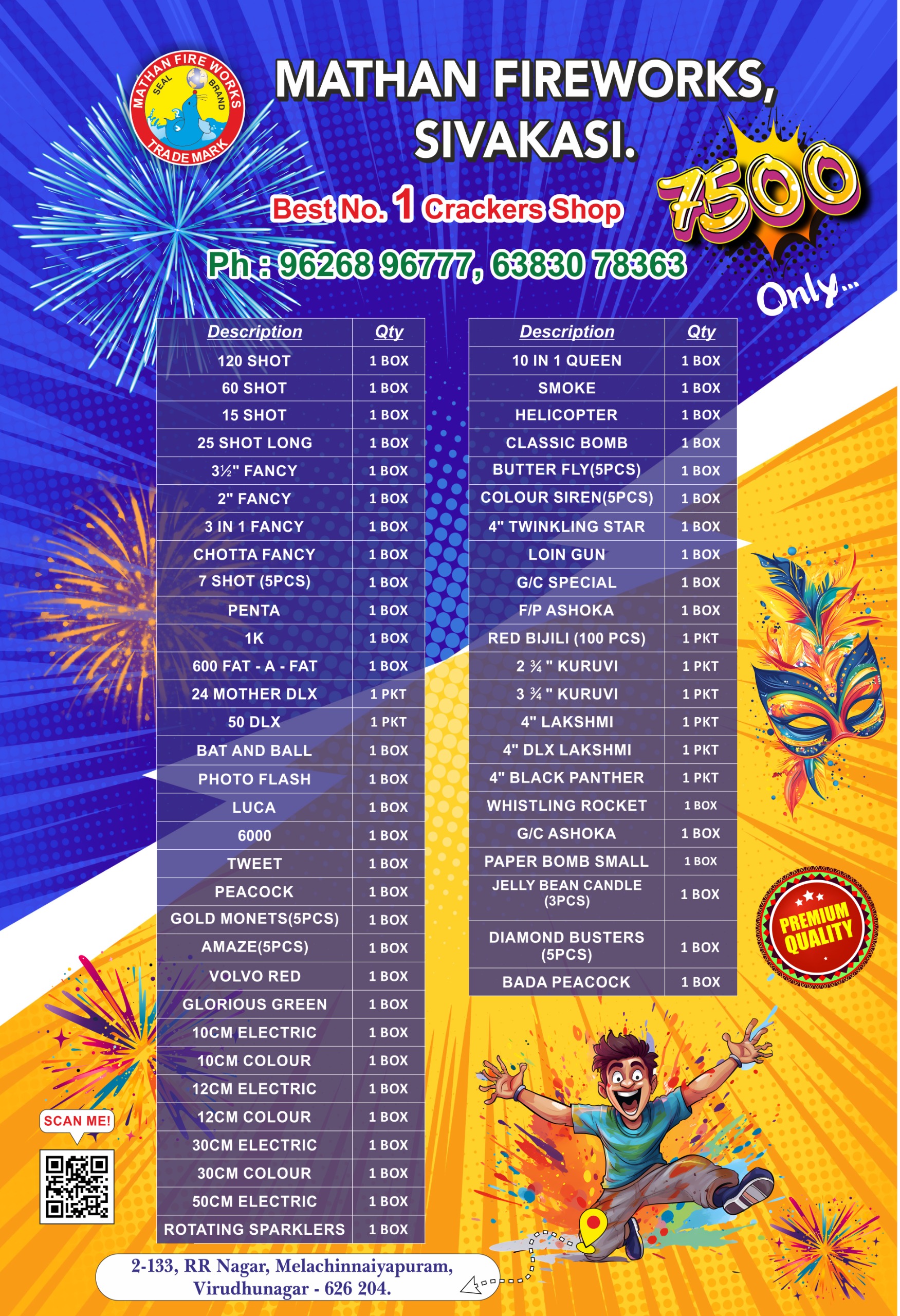 உங்கள் வீட்டு விஷேசங்கள், கோவில் திருவிழாக்கள் மற்றும் தீபாவளிக்கு தேவையான அனைத்து விதமான பட்டாசுகள், வானவேடிக்கைகளை மொத்த விலைக்கே தமிழ்நாடு முழுவதும் பாதுகாப்பாக அனுப்புகிறோம்.